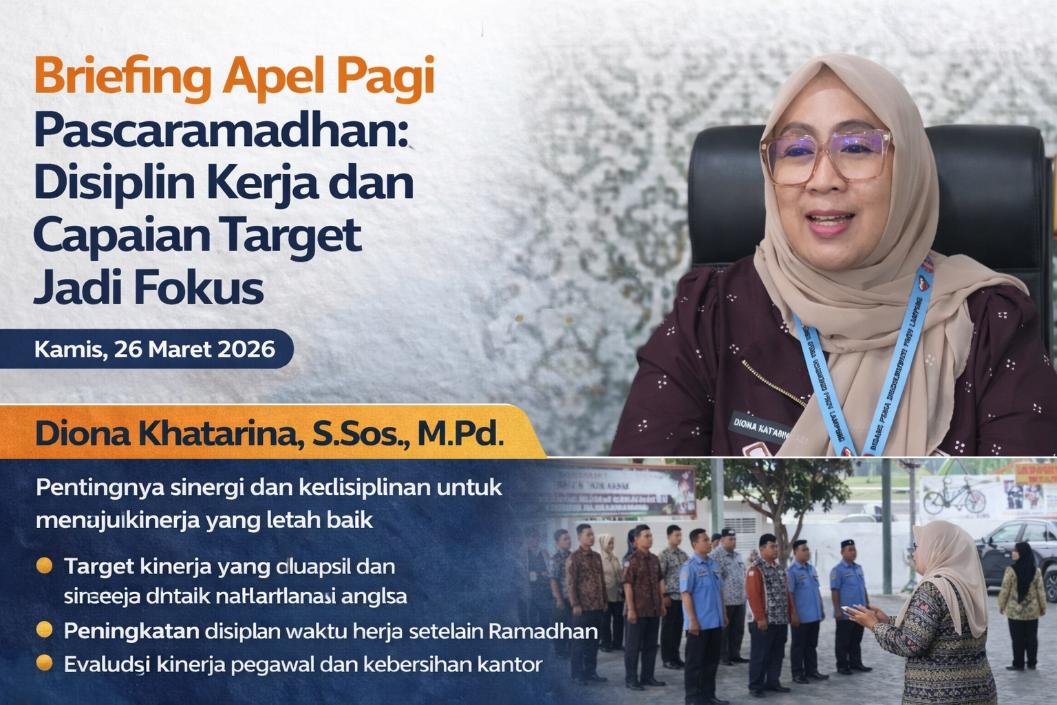 Selain pembahasan terkait kinerja, apel pagi tersebut turut menyoroti pentingnya peningkatan disiplin waktu kerja, khususnya setelah bulan Ramadhan. Hal ini dinilai krusial untuk menjaga ritme produktivitas dan memastikan pelayanan tetap berjalan optimal.