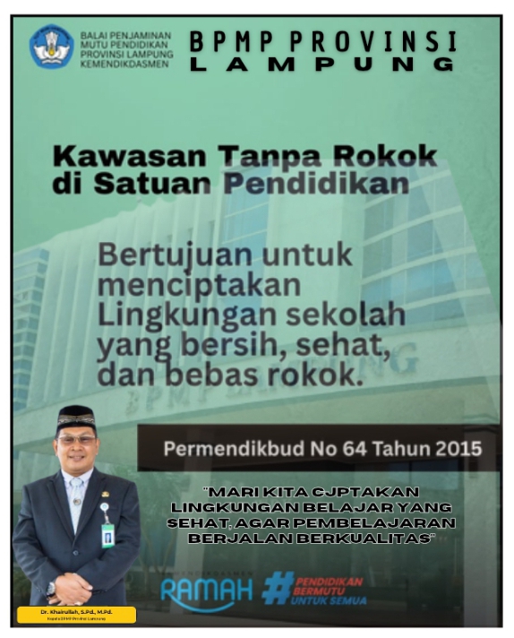 Bandar Lampung — Balai Penjamin Mutu Pendidikan (BPMP) provinsi Lampung menghimbau kepada satuan pendidikan agar mentaati Permendikbud-RI No. 64 Tahun 2015 tentang : Kawasan Tanpa Rokok Disatuan Pendidikan.