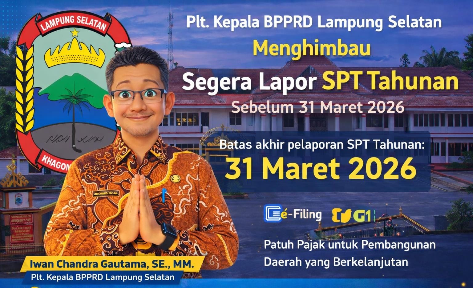 Lampung Selatan – Pelaksana Tugas (Plt.) Kepala Badan Pengelola Pajak dan Retribusi Daerah (BPPRD) Kabupaten Lampung Selatan, Iwan Chandra Gautama, SE., M.M., menghimbau kepada seluruh wajib pajak untuk segera melaporkan Surat Pemberitahuan (SPT) Tahunan sebelum batas waktu yang telah ditentukan, yakni 31 Maret 2026.