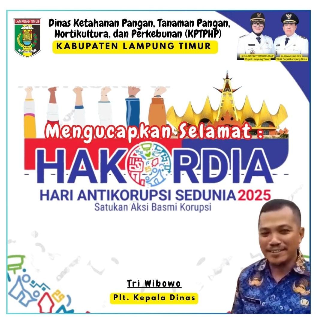 Lampung Timur – Dinas Ketahanan Pangan, Tanaman Pangan, Holtikultura dan Perkebunan (DKPPTH & Perkebunan) Kabupaten Lampung Timur Mengucapkan Selamat Memperingati Hari Anti Korupsi Sedunia (HAKORDIA) 09 Desember 2025.