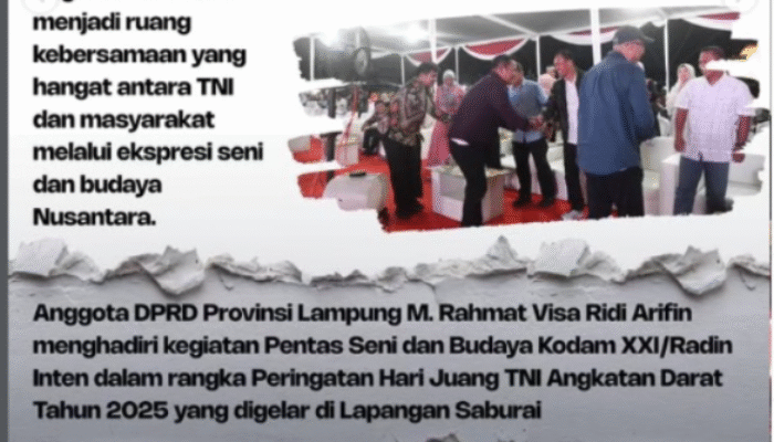 Dalam keterangannya, M. Rahmat Visa Ridi Arifin menyampaikan apresiasi tinggi atas inisiatif Kodam XXI/Radin Inten yang menghadirkan kegiatan budaya sebagai sarana mempererat hubungan antara TNI dan masyarakat.