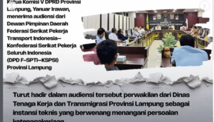 Bandar Lampung — Dewan Perwakilan Rakyat Daerah (DPRD) Provinsi Lampung menerima audiensi dari Dewan Pimpinan Daerah Federasi Serikat Pekerja Transport Indonesia–Konfederasi Serikat Pekerja Seluruh Indonesia (DPD F-SPTI–KSPSI) Provinsi Lampung, terkait pengaduan pekerja di PT Global Jet Express (J&T). (Rabu, 7 Januari 2026)