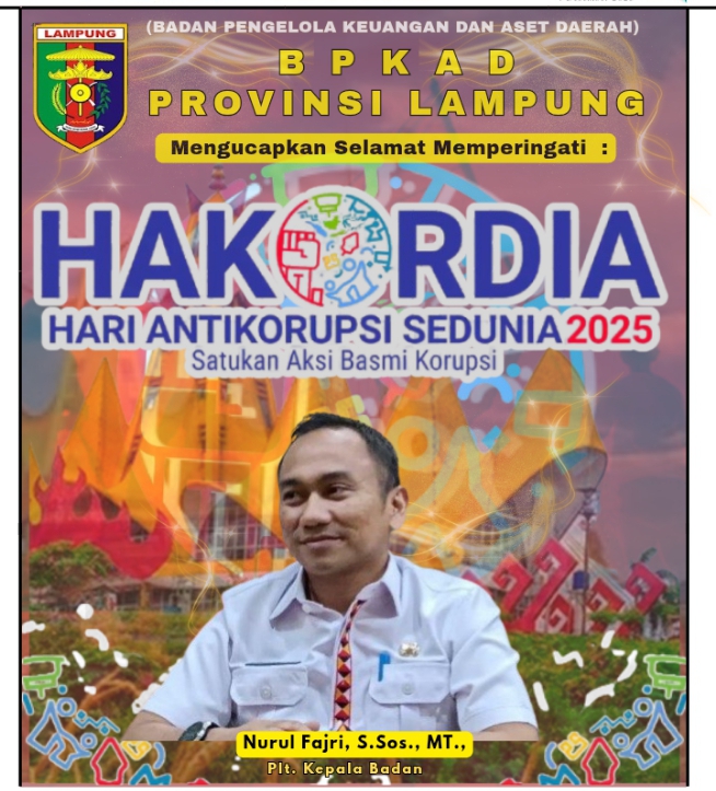 Bandarlampung, akbr.news — Dalam rangka memperingati Hari Anti Korupsi Sedunia (Hakordia) yang jatuh pada tanggal 9 Desember 2025, Nurul Fajri, S.Sos., M.T., selaku Plt. Kepala Badan Pengelola Keuangan dan Aset Daerah (BPKAD) Provinsi Lampung, turut menyampaikan dukungan dan komitmen dalam upaya pemberantasan korupsi.