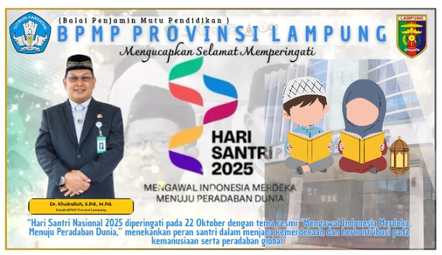 “Melalui Hari Santri Nasional 2025, yang diperingati pada 22 Oktober dengan tema resmi “Mengawal Indonesia Merdeka, Menuju Peradaban Dunia,” menekankan peran santri dalam menjaga kemerdekaan dan berkontribusi pada kemanusiaan serta peradaban global,” _ DR. KHAERULLAH, S.PD., M.PD. (Kepala BPMP Lampung).