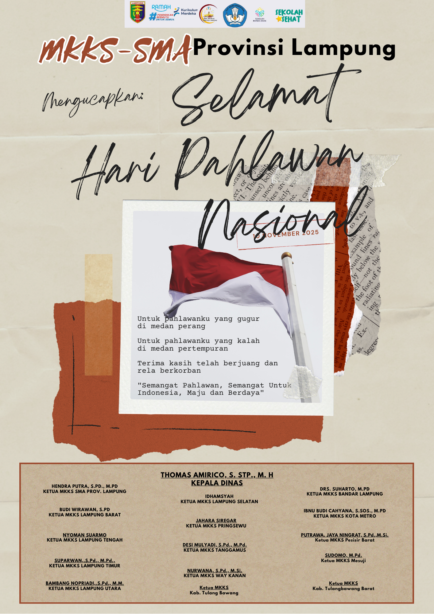 Bandarlampung, akbar.news — Keluarga Besar Musyawarah Kerja Kepala Sekolah (MKKS) SMA Provinsi Lampung mengucapkan: Selamat memperingati hari pahlawan 10 November 2025.