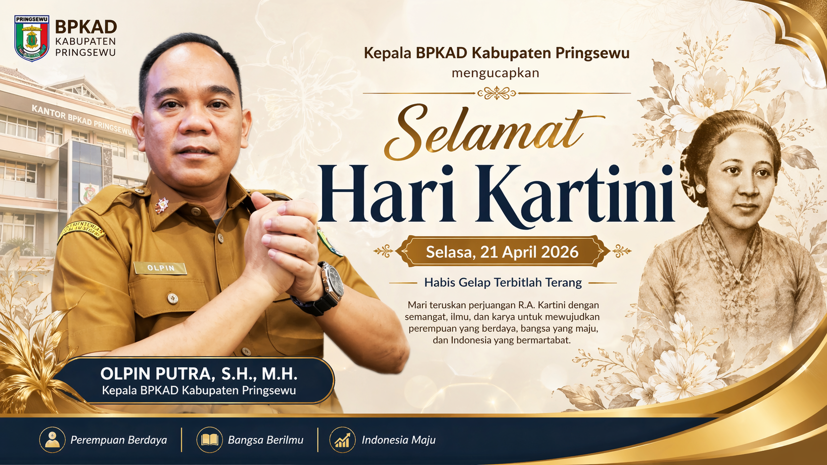 Pringsewu, www.akbar.news — Dalam rangka memperingati Hari Kartini yang jatuh pada Selasa, 21 April 2026, Kepala Badan Pengelolaan Keuangan dan Aset Daerah (BPKAD) Kabupaten Pringsewu, Olpin Putra, S.H., M.H., menyampaikan ucapan selamat sekaligus apresiasi kepada seluruh perempuan Indonesia, khususnya kaum perempuan di Kabupaten Pringsewu.