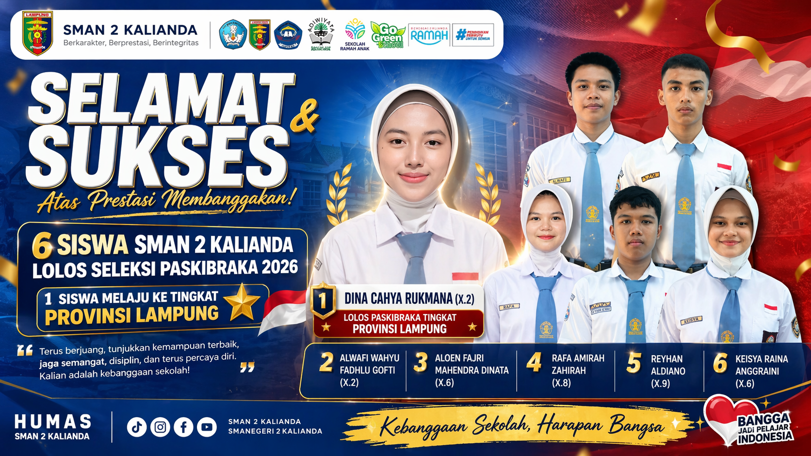 Kalianda, www.akbar.news – Kabar membanggakan datang dari SMAN 2 Kalianda. Sebanyak enam siswa terbaik berhasil lolos seleksi Calon Pasukan Pengibar Bendera Pusaka (Paskibraka) tingkat Kabupaten Lampung Selatan Tahun 2026.