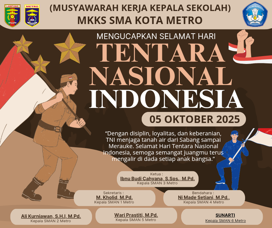 Kota Metro, — Seluruh Jajaran MKKS-SMA kota Metro mengucapkan. Selamat memperingati hari ulang tahun (HUT) TNI yang ke-80 tahun.