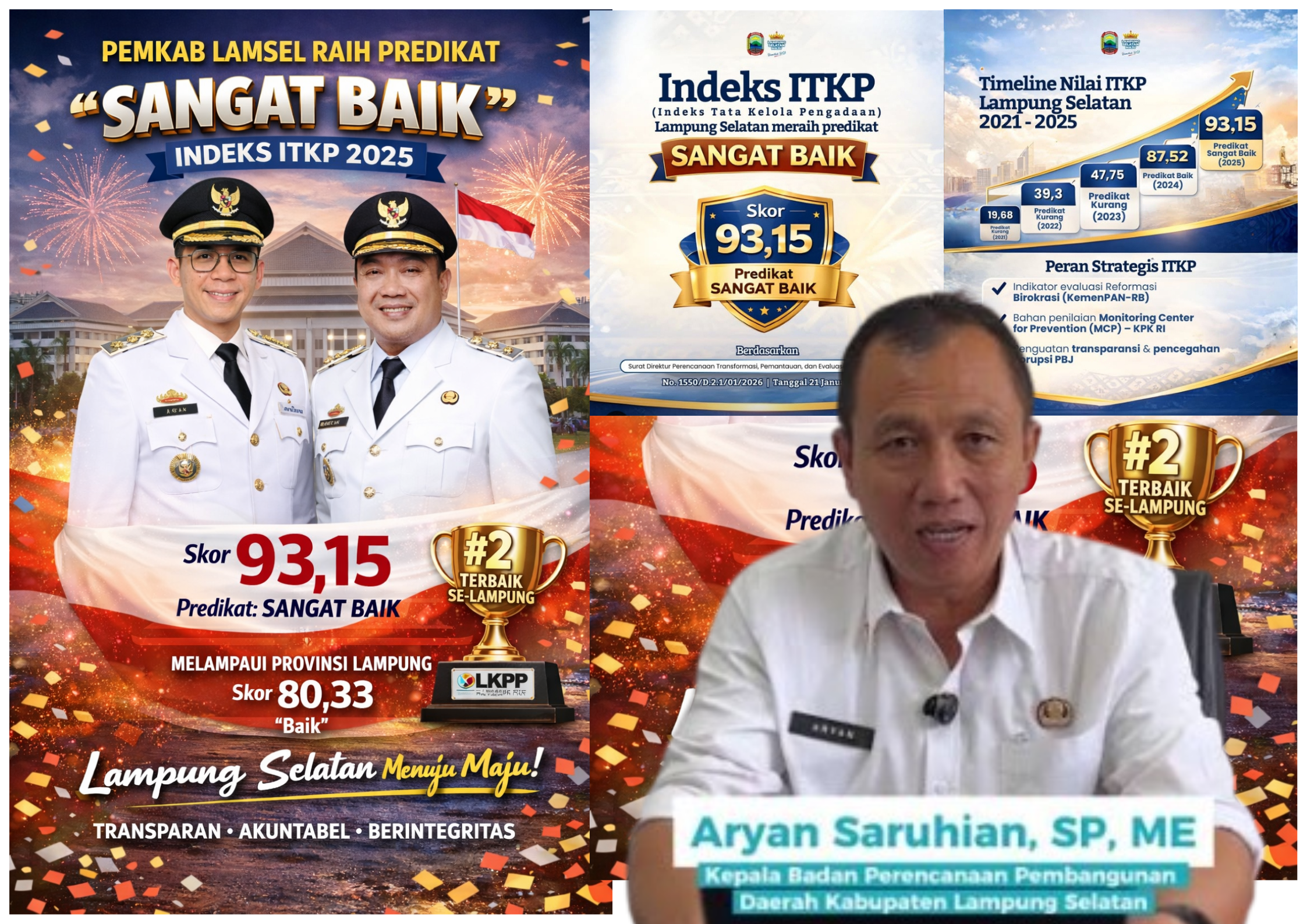 Hal tersebut disampaikan oleh Aryan Saruhian, Kepala Bappeda Lampung Selatan. Berdasarkan hasil penilaian Lembaga Kebijakan Pengadaan Barang/Jasa Pemerintah (LKPP) Republik Indonesia, Pemkab Lampung Selatan memperoleh skor 93,15 dengan predikat “Sangat Baik”. Capaian ini bahkan melampaui nilai Pemerintah Provinsi Lampung yang meraih predikat “Baik” dengan skor 80,33.