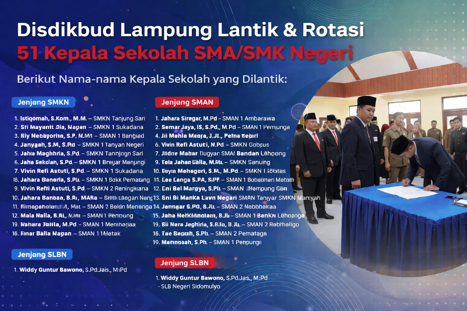 Bandar Lampung, — Pemerintah Provinsi Lampung melalui Dinas Pendidikan dan Kebudayaan Provinsi Lampung resmi melantik dan merotasi puluhan kepala sekolah tingkat SMA dan SMK negeri dalam sebuah agenda besar yang digelar pada Selasa (14/4).