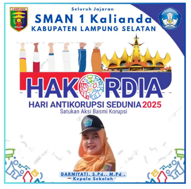 Kalianda, —Seluruh Jajaran SMAN 1 Kalianda, Kabupaten Lampung Selatan megucapkan : “Selamat Memperingati Hari Anti Korupsi Sedunia (HAKORDIA) 09 Desember 2025,” — Satukan Aksi – Basmi Korupsi