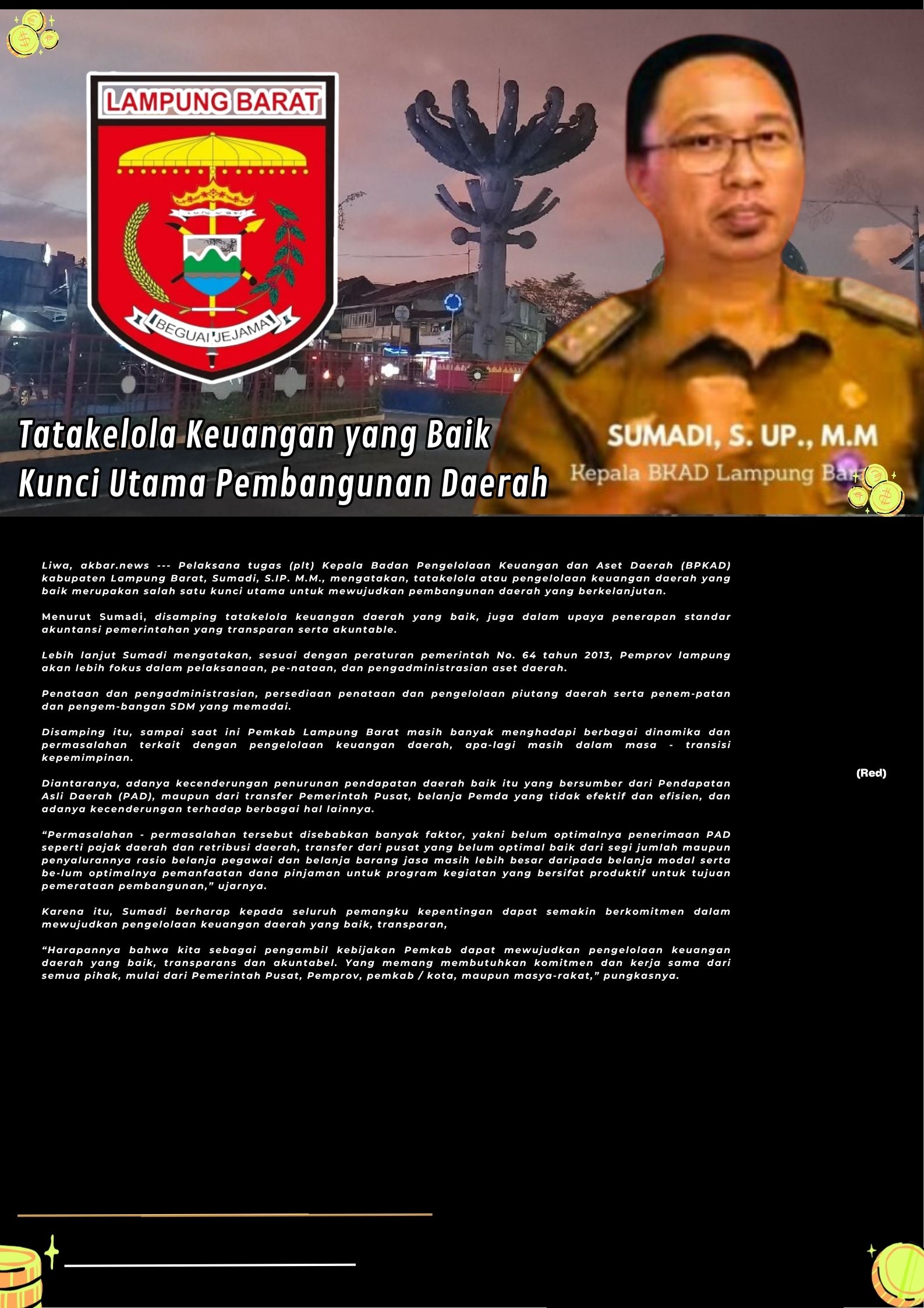 ,Liwa, akbar.news — Pelaksana tugas (plt) Kepala Badan Pengelolaan Keuangan dan Aset Daerah (BPKAD) kabupaten Lampung Barat, Sumadi, S.IP. M.M., mengatakan, tatakelola atau pengelolaan keuangan daerah yang baik merupakan salah satu kunci utama untuk mewujudkan pembangunan daerah yang berkelanjutan.